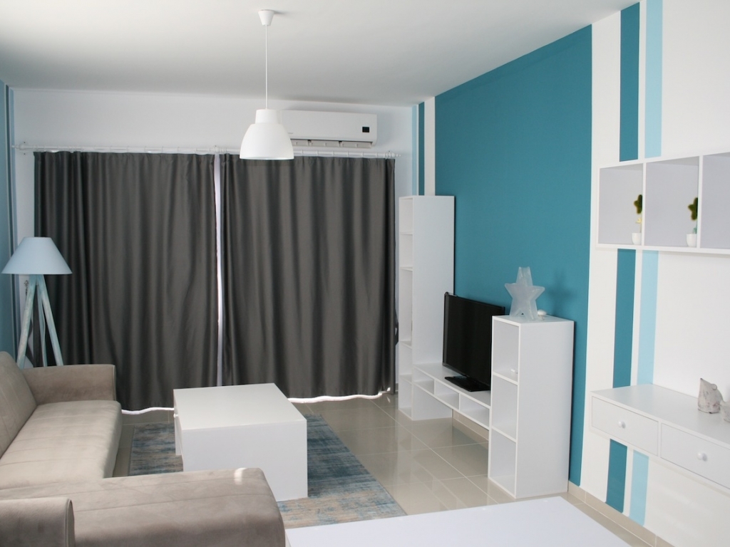 A bright, modern studio apartment with views overlooking the Mediterranean Sea and mountains from the other side.
